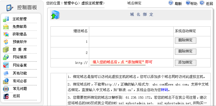 如果您同时在我司注册域名和虚拟主机,我司系统会自动解析并绑定。 如果您今后还注册了其他域名,也要绑定到原来的主机上,操作办法如下: 1.登录到管理中心,点业务管理,域名服务,点DNS解析管理,添加ip,增加www记录,指向我们提供的虚拟主机的ip(在虚拟主机管理界面里面可以看到该ip) 然后在虚拟主机管理中心>域名绑定,输入要绑定的域名,点添加。 如果您的域名是在其他公司注册的,请联系原域名注册商将域名解析到我的虚拟主机Ip上。